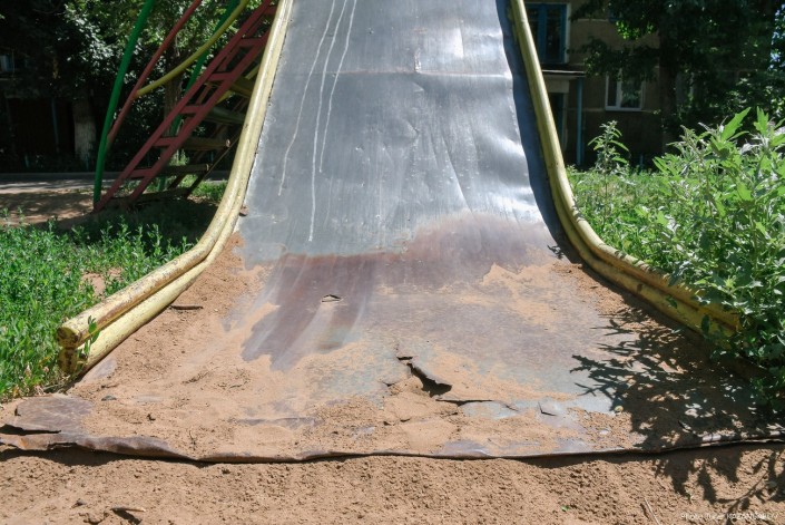 Детей здесь много, они катаются с горки, а там металлическое покрытие все пришло в негодность. "Дети катаются и рвут себе не только штаны", - говорят обеспокоенные женщины.