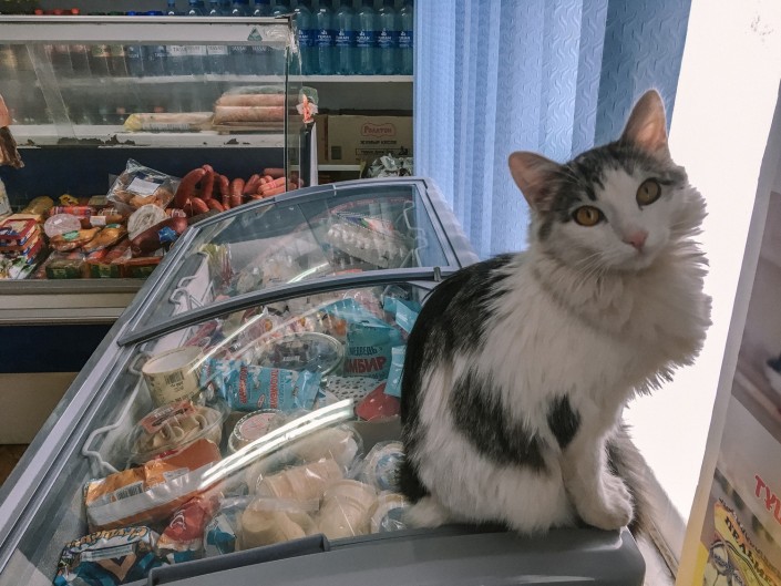 Это раньше, говорит женщина, торговля в Новый год шла хорошо, теперь люди все закупают в супермаркетах. Но все же есть здесь свои постоянные клиенты. В магазине есть свой кот.