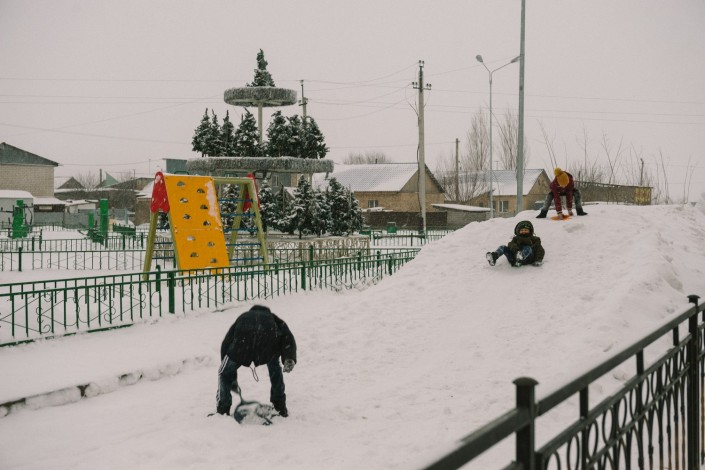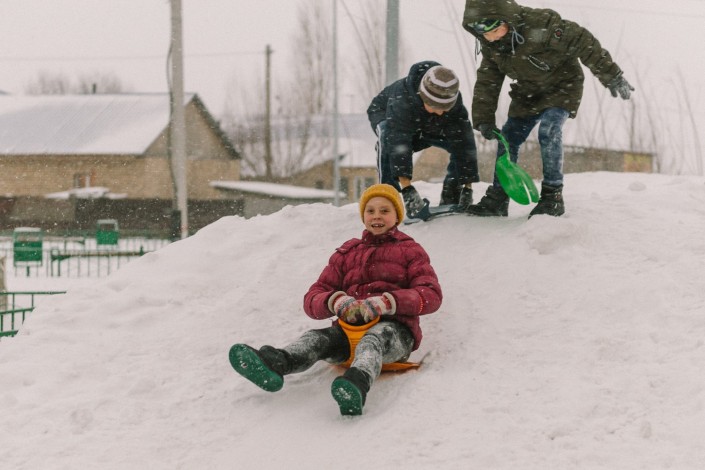 Несмотря на мороз, дети с удовольствием катаются с горки, пусть и не такой большой.
