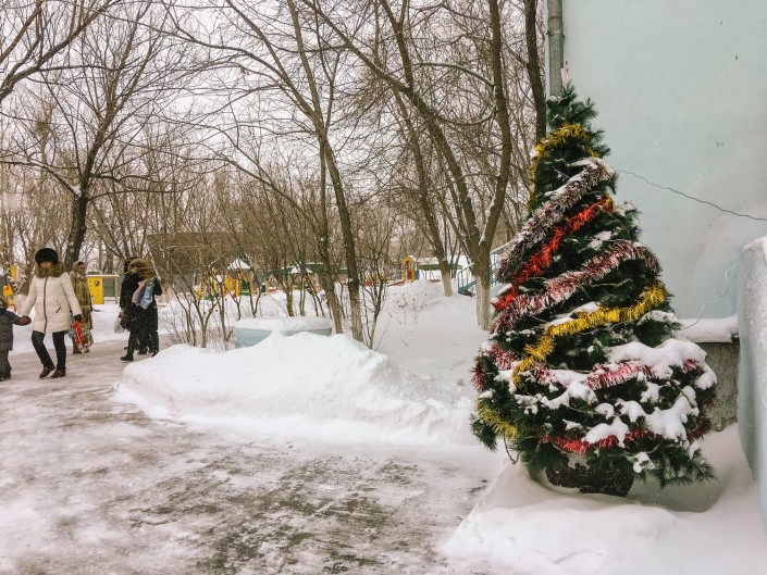 А в местном детсаду можно заметить наряженную елку.