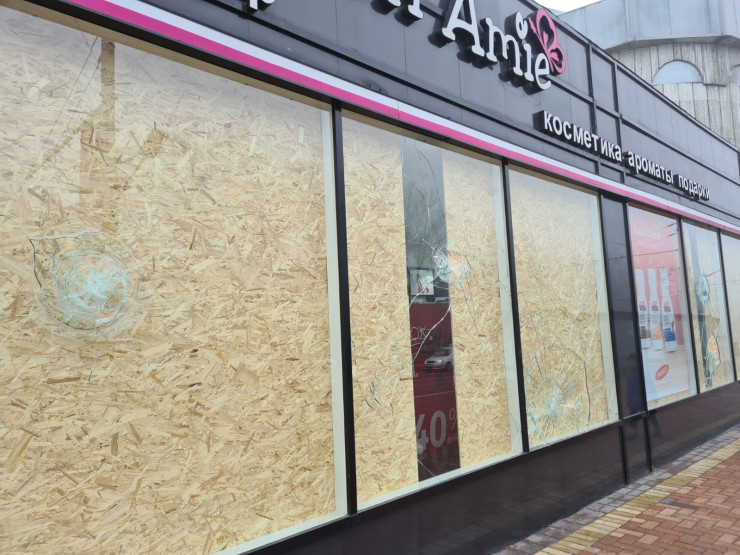 Неизвестные также разбили витрины магазинов и банковских отделений. По данным очевидцев, многие продовольственные магазины в центре города закрыты.