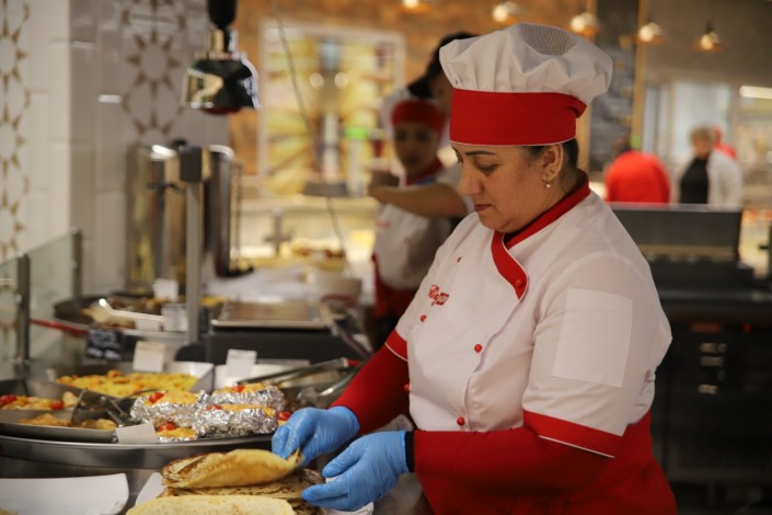Поблизости с ним находится большой отдел кулинарии. Здесь гости супермаркета могут приобрести различные готовые блюда. Нежные блины с пылу с жару, курочка с овощами, шницель с картофелем и многое другое не оставят равнодушным даже самого искушенного гостя. Предусмотрена зона фуд-корта для покупателей, где можно выпить чашечку кофе или чая, есть специальное меню завтраков.