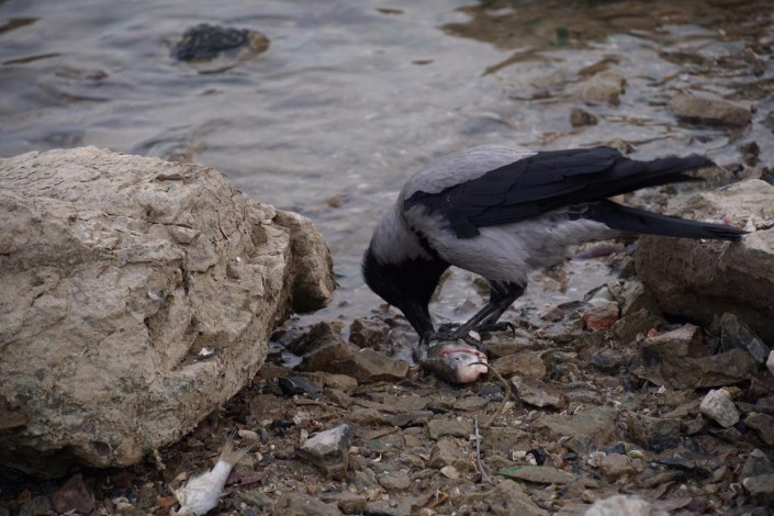 Крики чаек. На берег выбежала собака, схватила уже почти сухую рыбу, отнесла в сторонку и, придерживая добычу одной лапой, в два счета съела всю тушку. А потом тут же отправилась за добавкой. На побережье стоит специфический запах. Рядом с очередной мертвой рыбешкой валяется труп птицы.