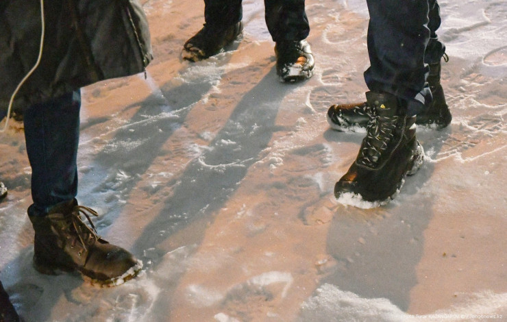 Снегопад усиливается. Журналисты замечают ботинки Алтая Кульгинова.