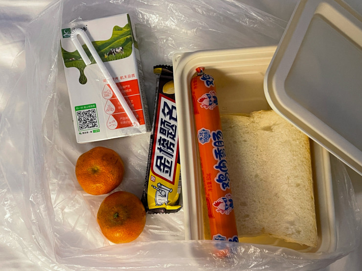Завтрак полагается бесплатный, но когда мне его принесли, я был очень удивлен увиденным. В то время, как внизу мои коллеги могли выбирать из большого ассортимента блюд, мое меню оказалось более чем скромным: ничего из горячего, только сникерс, хлеб, два мандарина, молочный напиток и сосиска (сосиску я на всякий случай есть не стал).