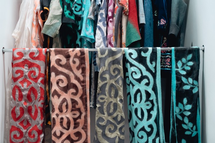 В туристском хабе Visit Almaty представлены шарфы и платки ручной работы.