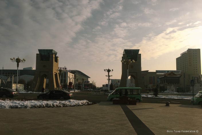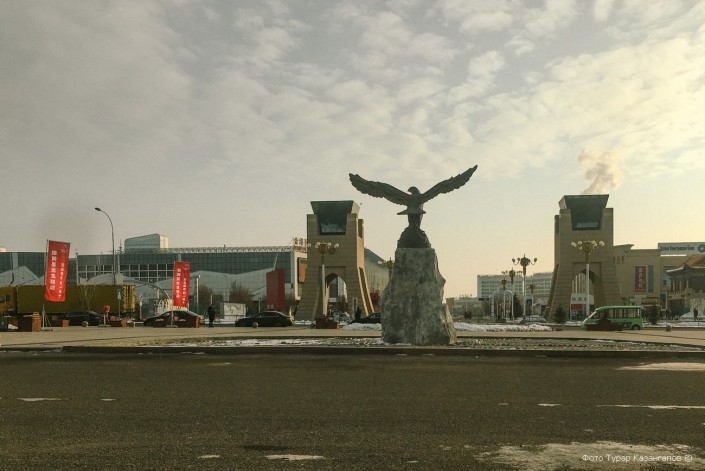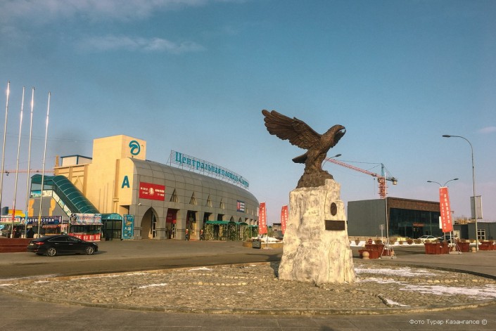 На казахстанской стороне есть центральная площадь. Она называется "Самрук". Здесь же находится монумент с птицей.