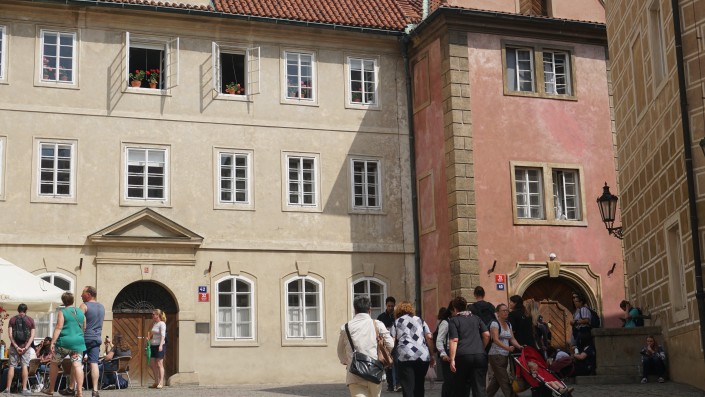 На площади перед старым королевским дворцом расположены дворцы влиятельных господ. Первоначально в них была расселена прислуга королей, но после частых пожаров знатных граждан переселили на площадь. К примеру, этот дворец принадлежал Шварценбергам.