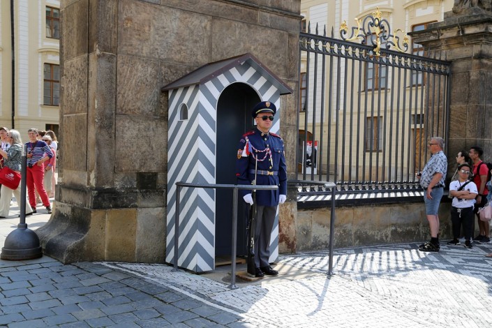 Мы, имея в запасе всего несколько часов, сразу же направились к Пражскому граду, самому большому дворцовому комплексу, занесенному в Книгу рекордов Гиннесса. В нем и сейчас расположена резиденция президента. Каждый час у входа можно увидеть торжественную смену караула. Почетный караул стоит в маленьких будках по две стороны от входа.
