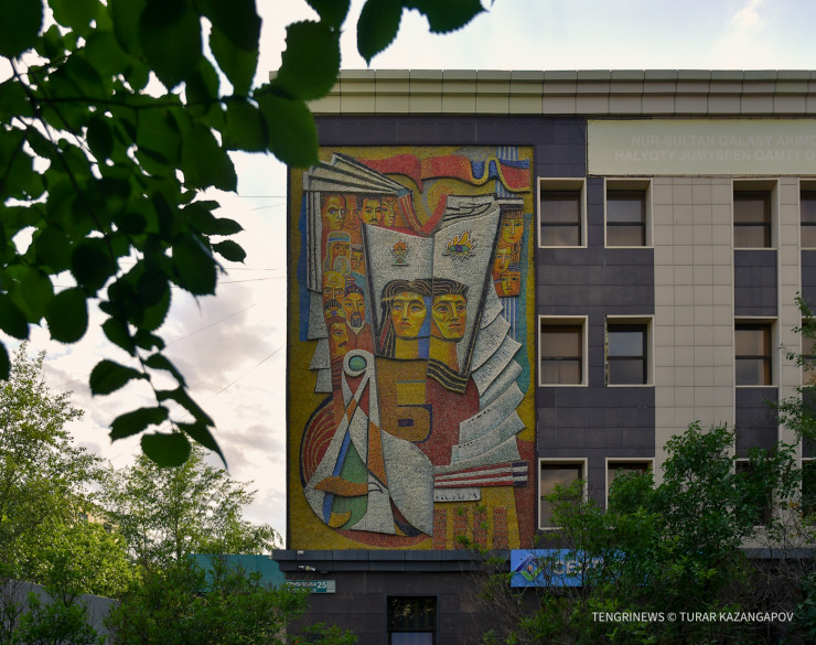 "Эта мозаика называется "Печать". Здесь очень интересный момент: на ней были указаны названия советских газет, однако в наши дни их закрасили. Изображены на ней девушка и парень на фоне книги, как олицетворение печати, издательского дела. В этом здании отпечатывались городские и региональные газеты. На ней также можно увидеть изображения лиц деятелей культуры и просвещения, так или иначе связанных с Казахстаном. Например, Абай Кунанбаев, Сакен Сейфулин, Тарас Шевченко. Кто изображен еще, мнения расходятся. Я разговаривал с сыном одного из авторов мозаики, он говорит, что одна из изображенных девушек справа - это царица Томирис", - делится исследователь.