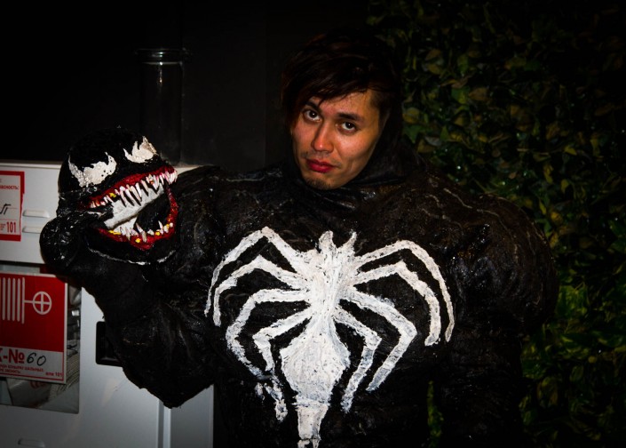 Косплеер Ролан решил облачиться в костюм Венома - злодея из вселенной Marvel. Парень специально прилетел из Астаны в Алматы ради участия в Almacon. "Этот костюм я сделал буквально за пять дней. Он полностью сделан из подручных средств: поролон, строительный силикон, старые вещи и ПВХ. В общей сложности на него ушло около 40 тысяч тенге, это мой самый дорогой костюм. То, чем я занимаюсь сейчас, называется "косплей". В общих чертах - реальность часто скучная, а это отличный способ побыть "с другой стороны". Плюс научиться новым вещам", - признается парень.