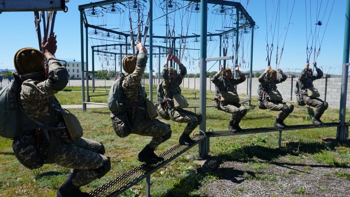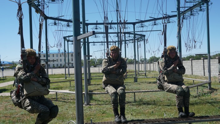 На самом деле солдаты срочной службы осваивали азбуку десантной подготовки по прыжкам. Мы застали молодых ребят на учебной базе десантно-штурмовых войск Талдыкорганского гарнизона. Вчерашние новобранцы уже по несколько часов в неделю отрабатывают здесь упражнения, представляя, что прыгнули из самолета с парашютом и летят в воздухе.