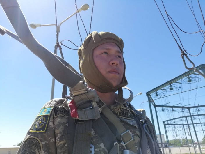 "В разных внештатных ситуациях имеются свои адекватные действия. Военнослужащий после отделения от самолета ведет отсчет времени. Отсчитывает ровно три секунды. После трех секунд, если не раскрывается основной парашют, первым действием солдат находит глазами кольцо запасного парашюта. Он выдергивает кольцо и вводит в действие второй парашют", - поясняет Мади Ахметов.