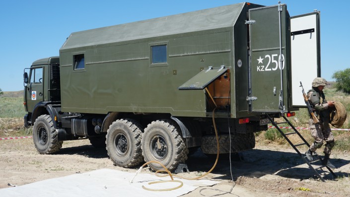 "Эта установка предназначена для прохода минных полей противника взрывным способом. Техника состоит из базовой машины и пускового оборудования. Такая же техника использовалась во время чеченской кампании. Сейчас используется в Сирии", - отметил командир дорожной роты Батыр Шоканулы.