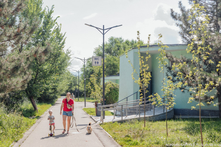 Внутри парка возле кафе стоит туалет с надписью City Toilet, стоимость - 100 тенге. Прямо перед нами его закрыли по непонятным причинам. Женщина с ребенком, которая стояла в очереди, от безысходности повела чадо в кусты.