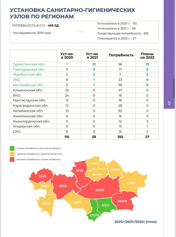 "Я подала запрос в Комитет индустрии и туризма, и они предоставили мне справку о том, что потребность в туалетах в целом по республике в туристических локациях и не только - 493 туалета. Комитет не может этим заниматься, все это делается через областные и городские акиматы. В 2020 году из этих 493 ни шатко ни валко построили 110. Теперь те, что построили, не функционируют.