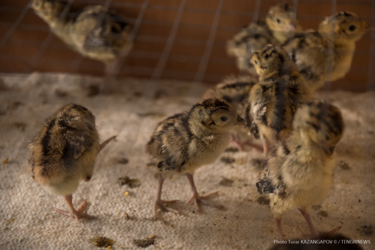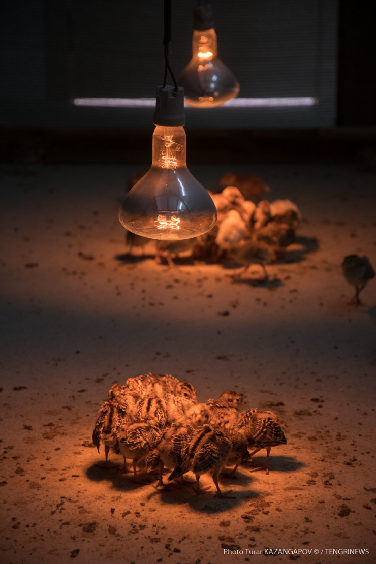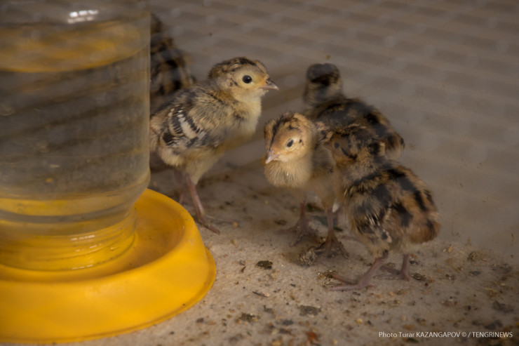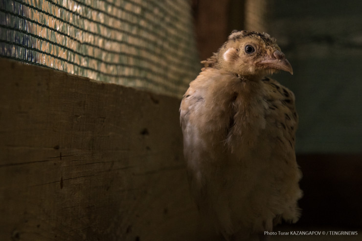 "Кормим их простоквашей", - заботливо говорит птицевод Сейдолла Абильдин, глядя на птиц, которым всего пятнадцать дней от роду. Он работает с фазанами уже восемь лет.