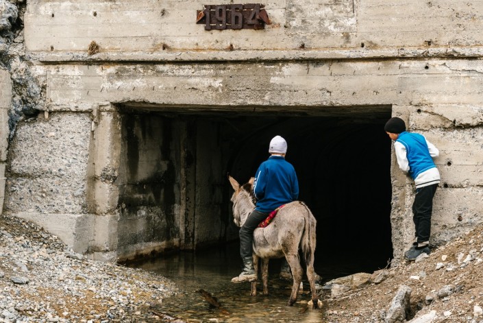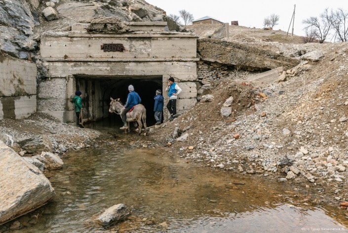 В сопровождении сельской ребятни и, конечно, уже знакомого нам мальчугана на ослике Бахыт показывает нам вход в одну из заброшенных шахт.