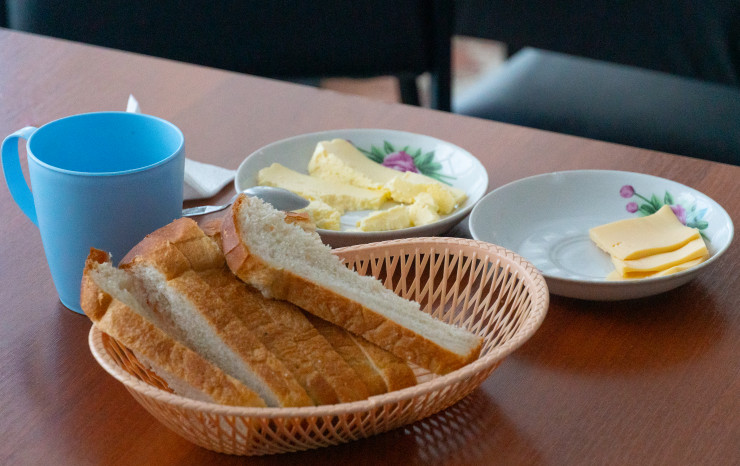 Я тоже решил позавтракать здесь. Чай, целая корзина хлеба, масло и сыр - такой перекус мне обошелся в 200 тенге.