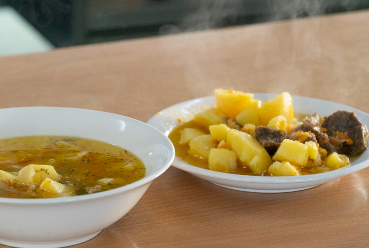 В столовой готовят обеды для рабочих, горячую еду раскладывают по термосам.