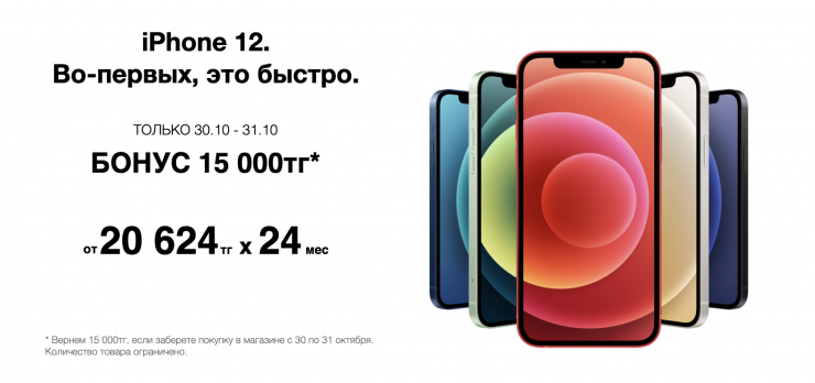 Если забирать новенький iPhone 12 из магазинов Technodom, Sulpak, Mechta, Fora, Evrika в вашем городе 30 либо 31 октября, вам не только помогут его настроить, но и начислят дополнительный бонус в 15 000 тенге!