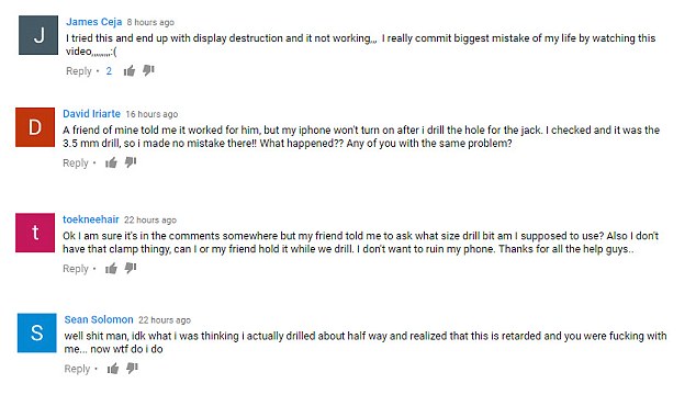 "Друг сказал мне, что это работает. Но мой iPhone, после того, как я просверлил отверстие, перестал включаться. Что случилось? У кого такие же проблемы?" - спросил другой незадачливый пользователь.