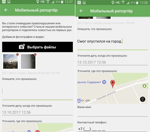 Кнопка раздела расположена в верхней части приложения, слева от курса валют. Для того чтобы отправить в редакцию фото- или видеофайл необходимо выполнить следующие действия.