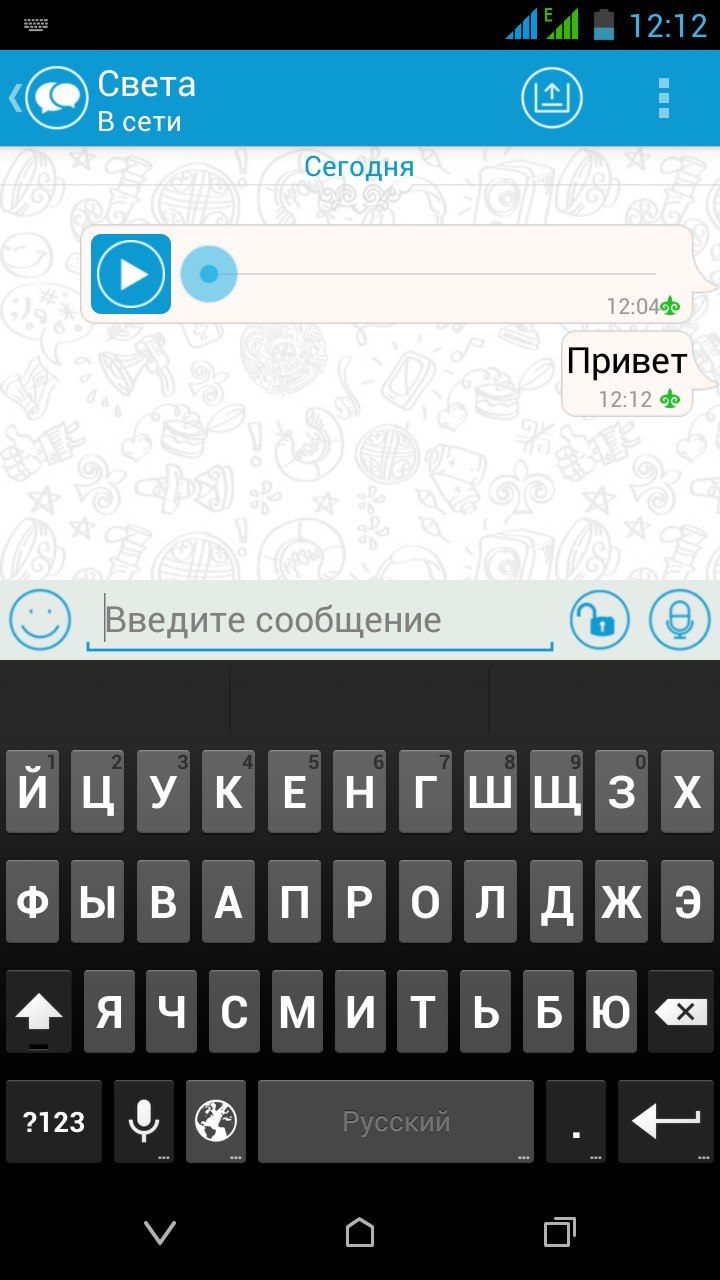 Процесс переписки также схож с другими мессенджерами. О том, что сообщение доставлено, сигнализирует зеленая метка. К слову, звуковой сигнал о принятых сообщениях представляет собой мелодию, исполненную на шан-кобызе. Кроме того, можно отправлять голосовые сообщения. Звонить через приложение, как в WhatsApp или Viber, нельзя.