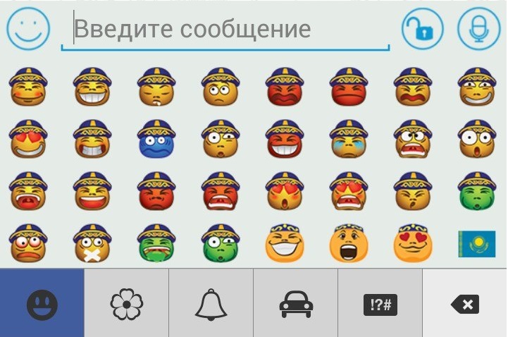 Набор смайлов специфический. Помимо стандартных смайликов в приложении есть "рожицы" в национальных головных уборах.