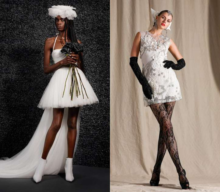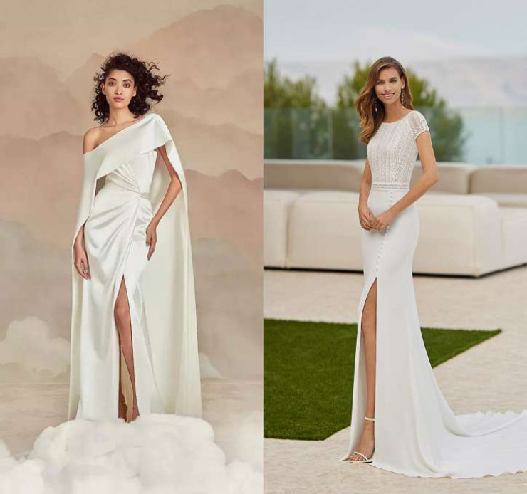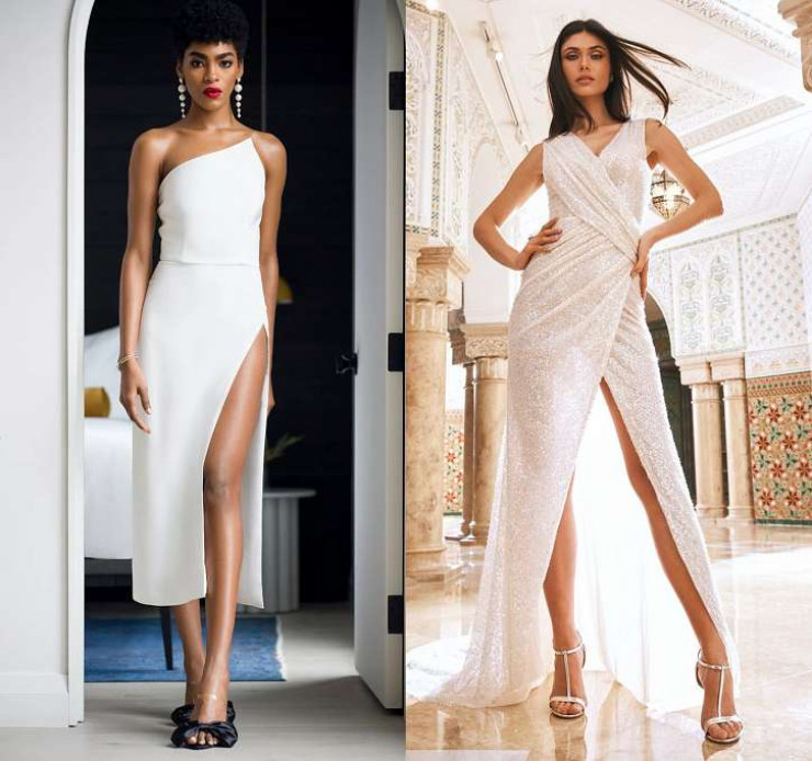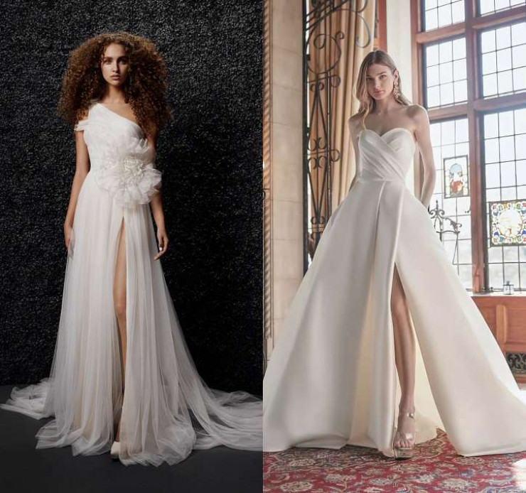 Дизайнеры решили, что после длительного карантина невесты уж точно захотят выглядеть если не экстравагантно (к примеру, в платье с перьями), то максимально эротично. И вариантов таких платьев в коллекциях было немало. Если коварная "русалка" и платье с глубоким вырезом – это не "ваш фасон", то есть возможность продемонстрировать красоту ног, причем в полном объеме.