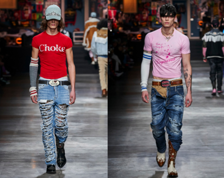 От бренда Dsquared2 был исполнен стиль Y2K на мужской манер. Теперь стразы, джинсы на заниженной талии, укороченные топы с яркими принтами можно носить и мужчинам. Братья-близнецы – основатели Dsquared2 - исправляют эту ошибку, стирая гендерные рамки и границы.