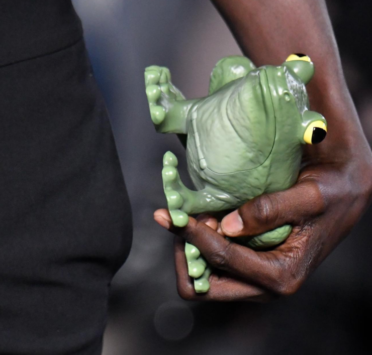Необычные аксессуары – конек дизайнера, однако их становится слишком много. Только стоит вспомнить его фирменный клатч в форме голубя. И в этот раз дизайнер обратился к животному миру. Помимо резиновых тапочек-лягушек из коллаборации с Wellipets, дизайнер представил клатч-лягушку в конце показа.