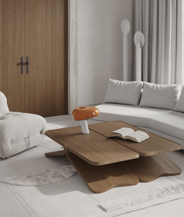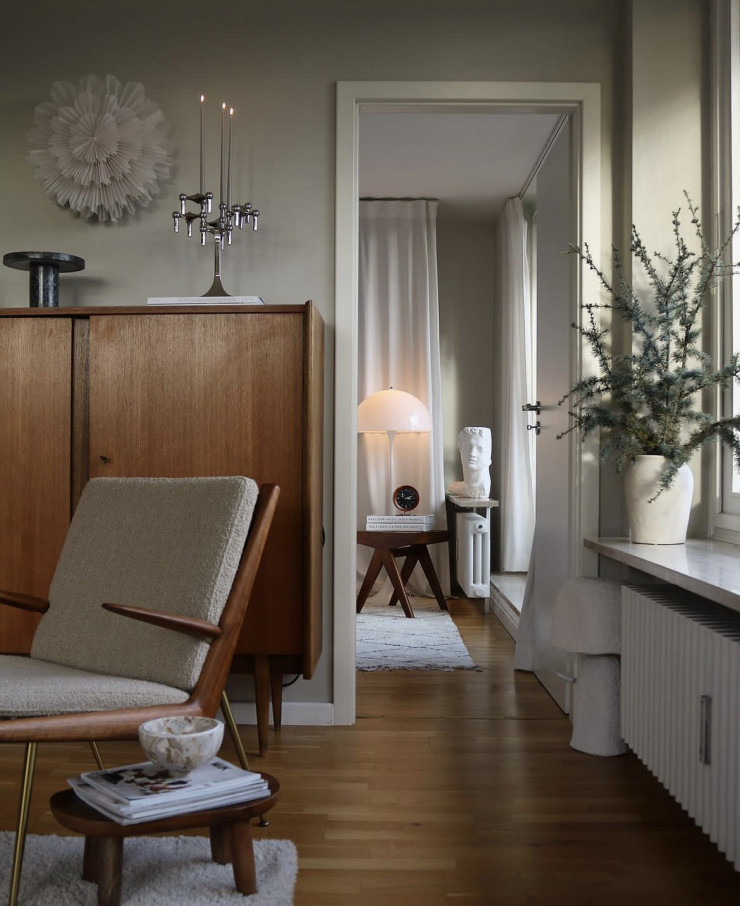 В первую очередь это выражается в палитре, ведь в качестве основы берутся теплые оттенки в бежево-коричневой гамме, разбавленные приглушенными цветами красного, желтого, оранжевого. Их дополняют тактильно приятные фактуры в виде дерева, текстиля и плавных скругленных форм.