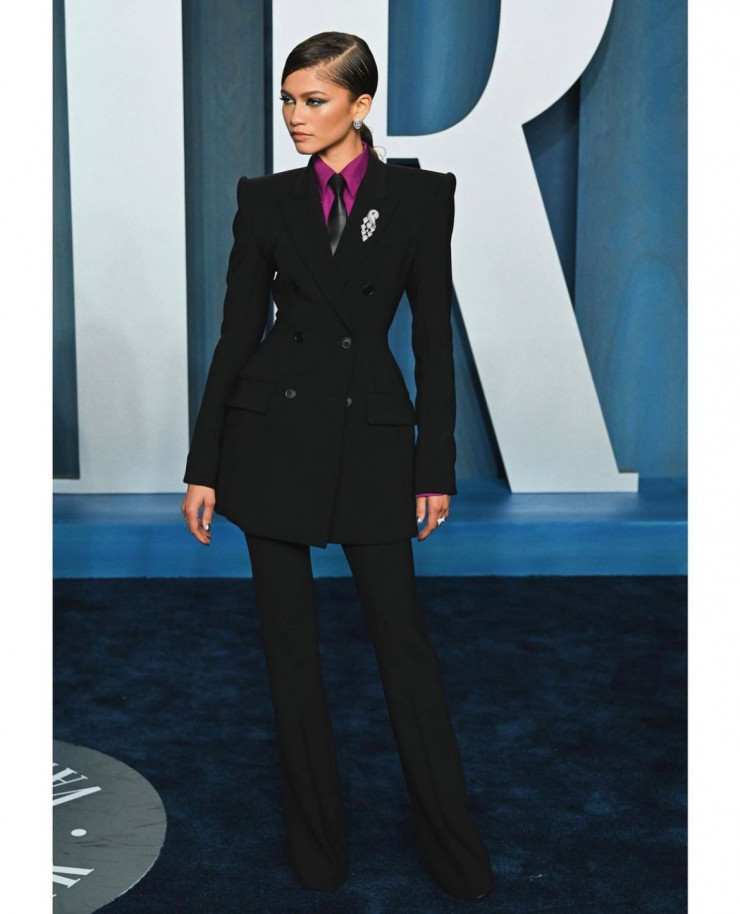 На вечеринке Vanity Fair девушка появилась в обтягивающем смокинге бренда Sportmax. Черную двойку Зендая дополнила шелковой блузой сливового оттенка и черным кожаным ремнем. На лацкане красовалась массивная брошь с россыпью крупных бриллиантов - королева драматических образов.
