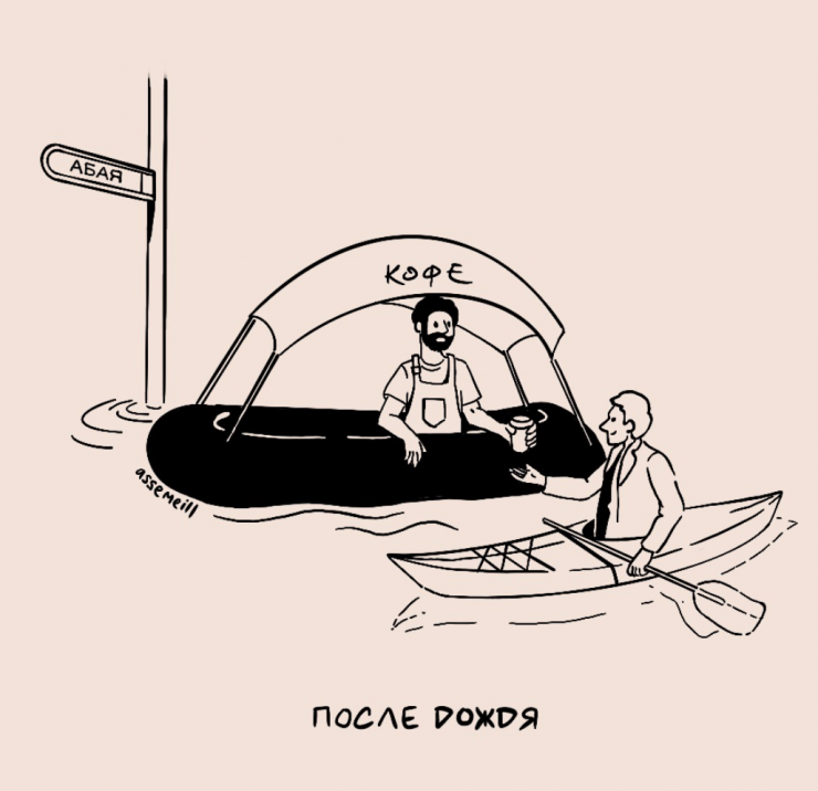 Также художница пошутила над ситуацией, которая происходит в городе из-за дождей. Нередко Алматы топит, но и это не мешает кофеманам бежать за чашкой бодрящего напитка в непогоду.