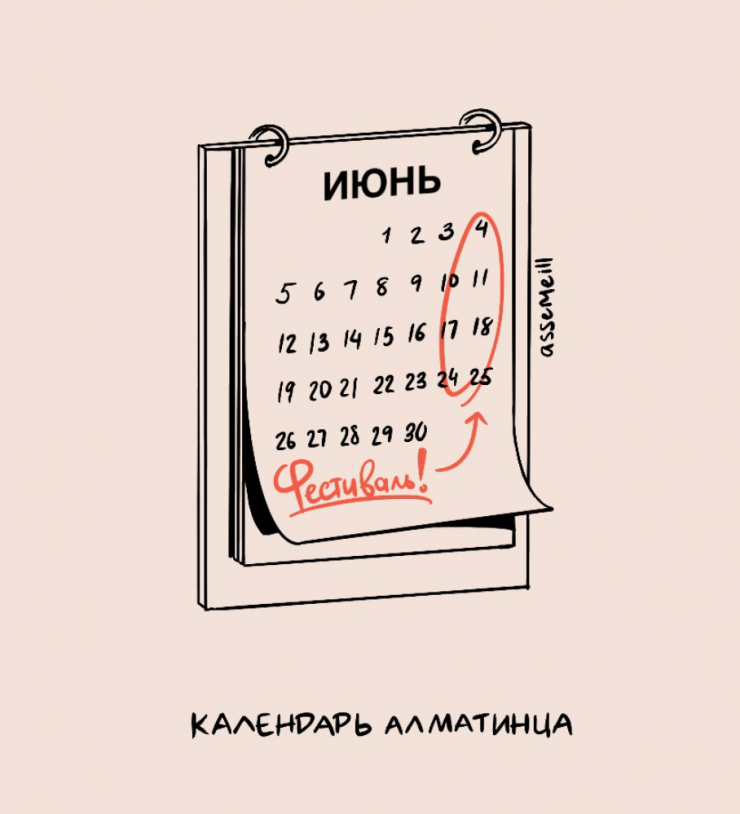 Например, в июне южная столица открывает сезон музыкальных фестивалей под открытым небом. Поэтому именно так выглядит календарь алматинца, по мнению автора.
