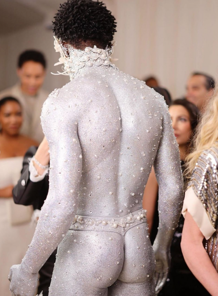Автор хита Industry Baby - Lil Nas X - позировал фотографам почти топлес и в ботинках на платформе и высоченных каблуках. Отметим, что тело исполнителя было покрыто плотной серебристой краской, стразами и изысканными жемчужными деталями, превращающими его в "гламурного котика".