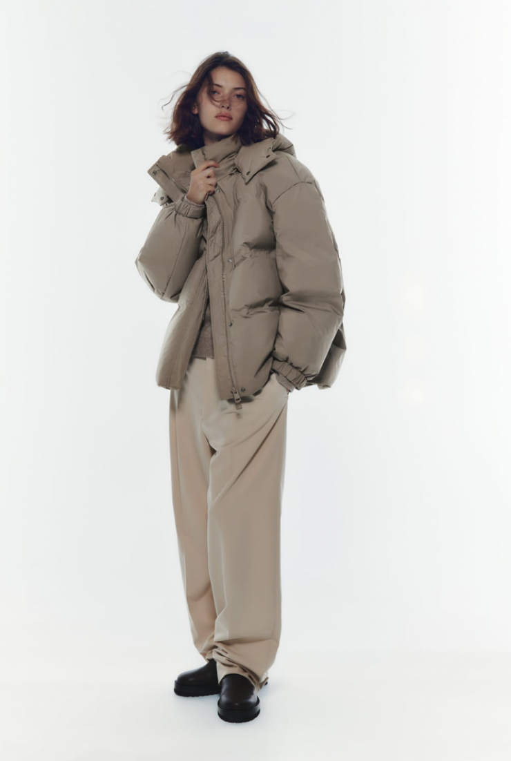 Более бюджетный, но не менее стильный вариант пуховика можно отыскать в массмаркете. Так, стеганая куртка в модном темно-бежевом оттенке подойдет под любой образ.