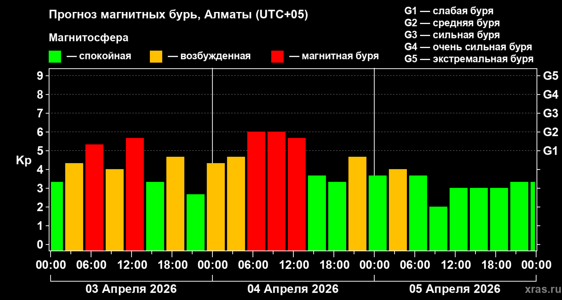 По данным лаборатории солнечной астрономии ИКИ и ИСЗФ, пик магнитной бури ожидается 4 апреля с 06:00 до 14:00. Согласно данным мониторинга, вероятность геомагнитной бури для Алматы оценивается в 100 процентов. Причиной стало усиление солнечного ветра из-за корональной дыры на Солнце.