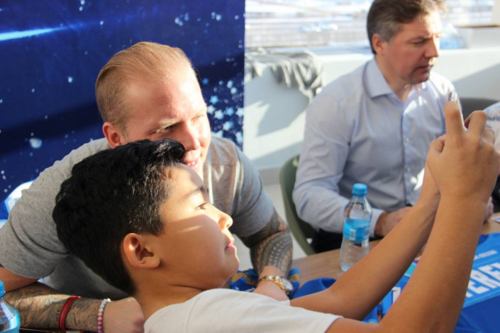 В полтора часа общения с фанатами вошли не только памятные росписи, но и совместное фотографирование с небольшой возможностью перекинуться парочкой слов.