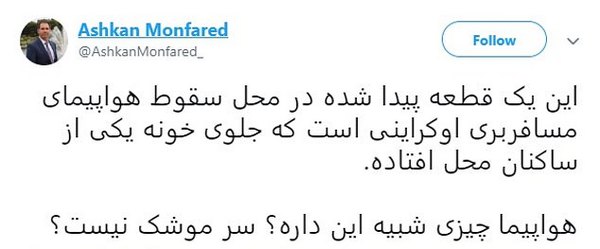 Как пишут "Факты", впервые фотография появилась в Twitter на страничке иранского активиста Ашкана Монфареда. На данный момент действие его учетной записи приостановлено. Он сопроводил снимок следующей подписью: "Это фрагмент, найденный на месте крушения украинского пассажирского самолета, упавший перед жилым домом. Разве у самолета есть нечто подобное? Разве это не ракета?"