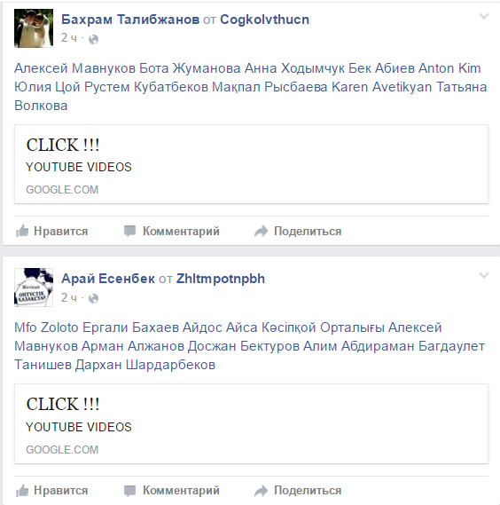 Пользователей соцсети Facebook поразил вирус, создающий от их имени несколько страниц для репоста подозрительной ссылки на "видео".  На этом посте, подписанном "CLICK!!! YOUTUBE VIDEOS GOOGLE.COM", вирус отмечает друзей владельца зараженной страницы. Tengrinews.kz составил подробную инструкцию о том, как избавиться от проблемы.