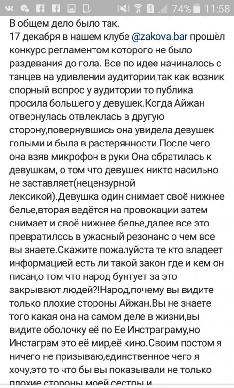 "Айжан Байзакову посадили на трое суток только потому, что она выражалась нецензурной бранью, которой выражаются у нас чуть ли не в каждой семье в мире, и в нашей стране тоже. И она проводила конкурс, где две девушки разделись за деньги. Во-первых, где мозги у этих самих девушек. Во-вторых, такого рода конкурсы проходят в каждом ночном заведении. Я лично знаю Айжан. Я знаю, что она вообще другой человек, нежели вы знаете и видите ее в Интернете", - записала видеообращение певица Bikabreezy.