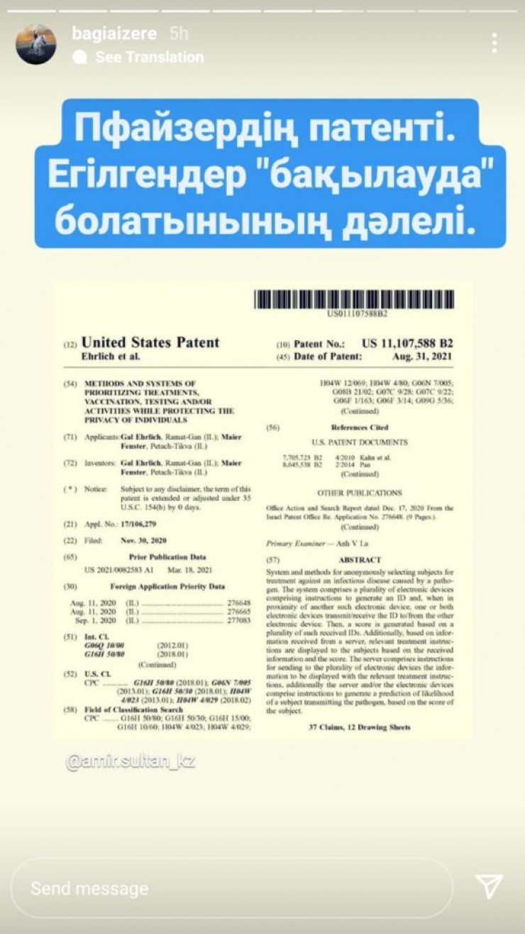 В социальных сетях казахстанцы обсуждают некий патент, который является "доказательством" того, что в вакцинах Pfizer/BioNTech содержатся устройства слежения. Документ якобы описывает, как именно они работают, и доказывает теории, ранее считавшиеся конспирологическими. В StopFake разоблачили рассылку, передает Tengrinews.kz.