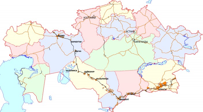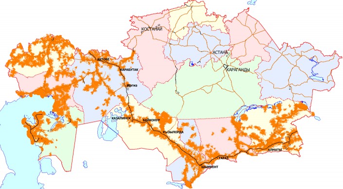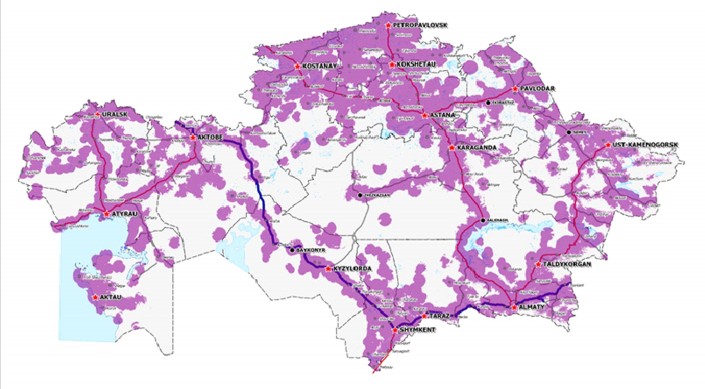 Карта покрытия трассы "Западная Европа - Западный Китай" сетью 2G Kcell.