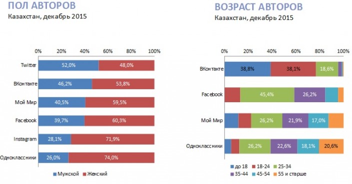 Добавим, что во время исследования были собраны и проиндексированы все публичные сообщения в социальных сетей на русском, казахском и других языках, а также данные их авторов. Для определения географии были взяты данные из профилей авторов, геометок сообщений. Пол и возраст был определен исходя из данных, указанных в профилях пользователей. Кроме того, данные о поле юзеров были дополнены информацией, полученной с помощью лингвистического анализа имен и фамилий авторов.