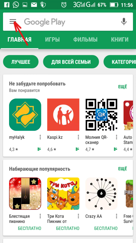 2. В программе Google Play нажмите на меню, отмеченное красной стрелкой.