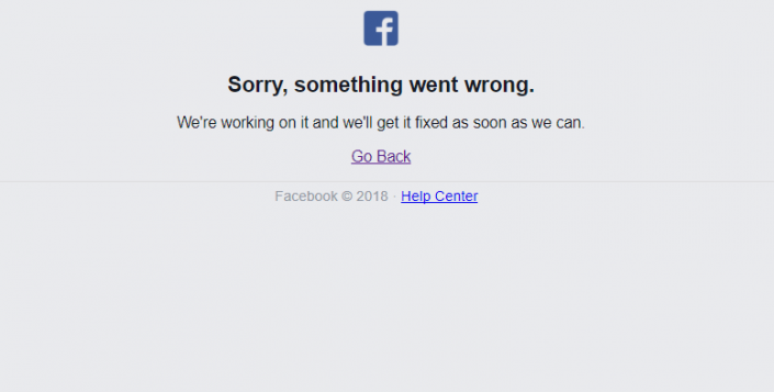 При попытке загрузить главную страницу Facebook возникает надпись с извинением и сообщение о том, что "что-то пошло не так".