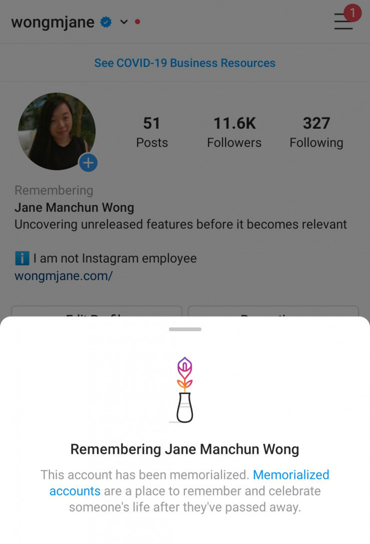 Instagram-ның баспасөз хатшысы Лиза Креншау BuzzfeedNews басылымына берген сұхбатында компания ұзақ уақыттан бері қайтыс болған қолданушылардың профилін есімімен сақтау белгісімен белгілейтін функцияны сынақтан өткізіп жатқанын айтты.
