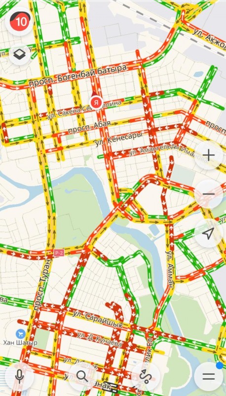 Сервис Яндекс.Карты отображает 10-балльную загруженность на центральных дорогах столицы. Заторы образовались на проспекте Республики, улицах Кенесары, Валиханова, Иманова, Бараева, Кунаева, на проспектах Абая, Богенбай батыра и Туран, улице Акмешит.